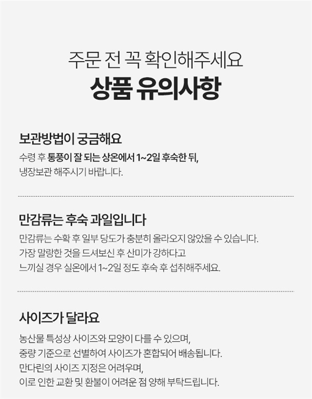 · 교환/반품 신청은 배송완료 후 24시간 이내 접수 가능합니다. 예외) 후숙과일 3일 이내 접수 가능