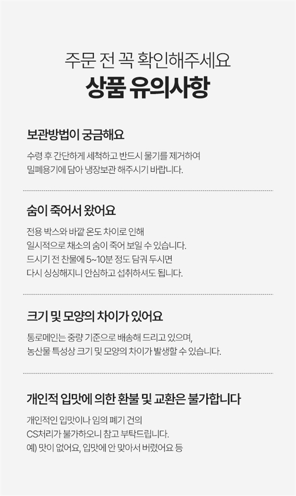 · 교환/반품 신청은 배송완료 후 24시간 이내 접수 가능합니다. 예외) 후숙과일 3일 이내 접수 가능