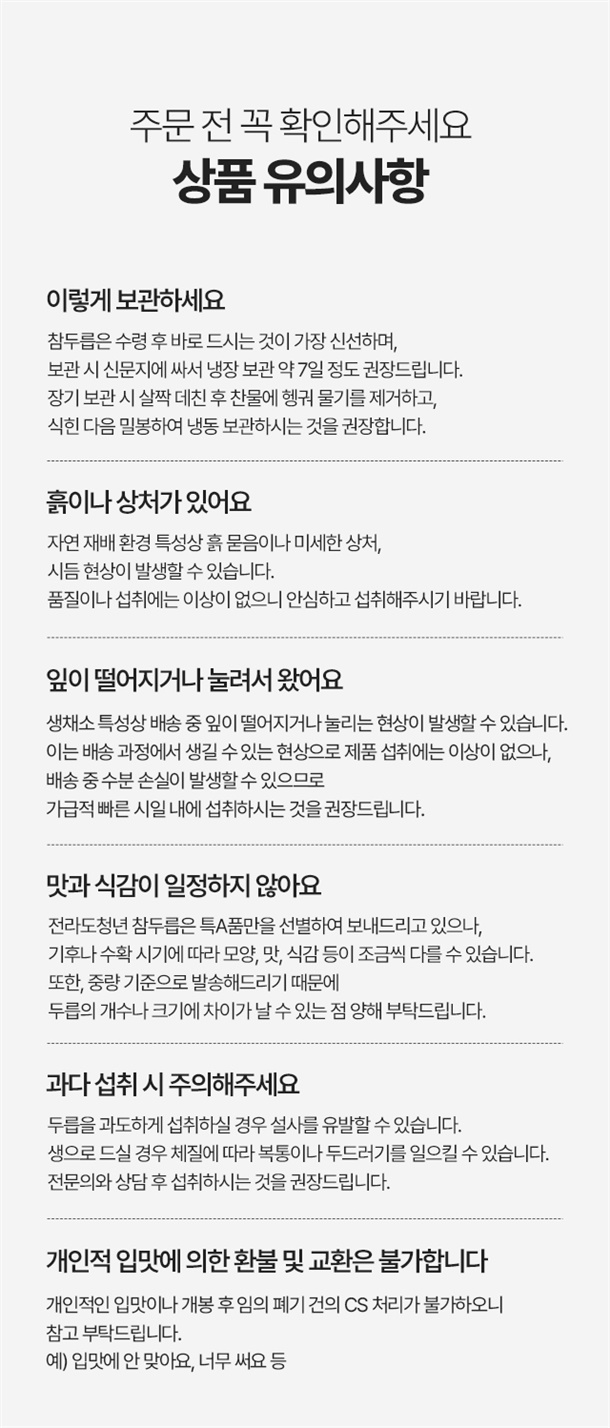 · 교환/반품 신청은 배송완료 후 24시간 이내 접수 가능합니다. 예외) 후숙과일 3일 이내 접수 가능