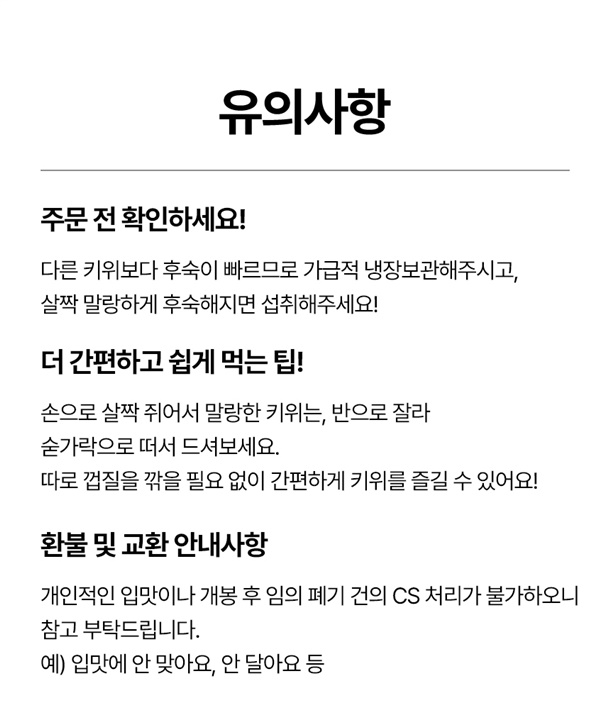 · 교환/반품 신청은 배송완료 후 24시간 이내 접수 가능합니다. 예외) 후숙과일 3일 이내 접수 가능